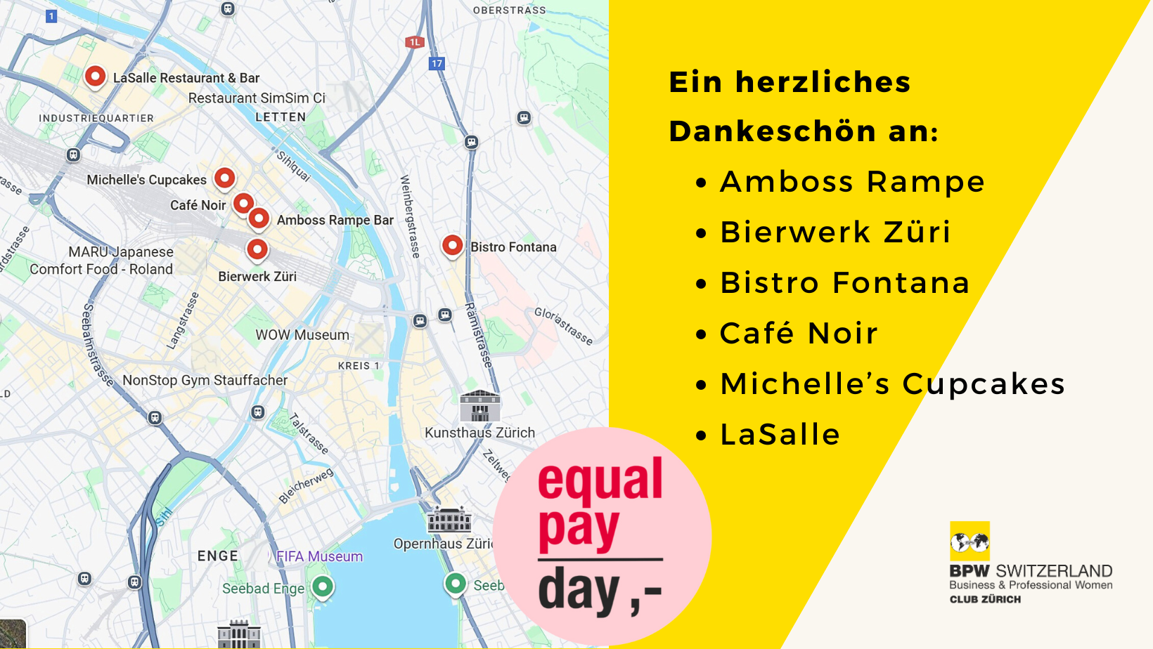 BPW Club Zürich hat Kollaborationen mit Zürcher Gastrobetriebe gestartet, die einen Spezialrabatt für Frauen in Höhe des aktuellen Gender Pay Gaps gewähren und drücken so ihr Commitment zu Lohngleichheit ausdrücken. Zusätzlich tragen folgende Organisationen mit einem Video Statement bei: